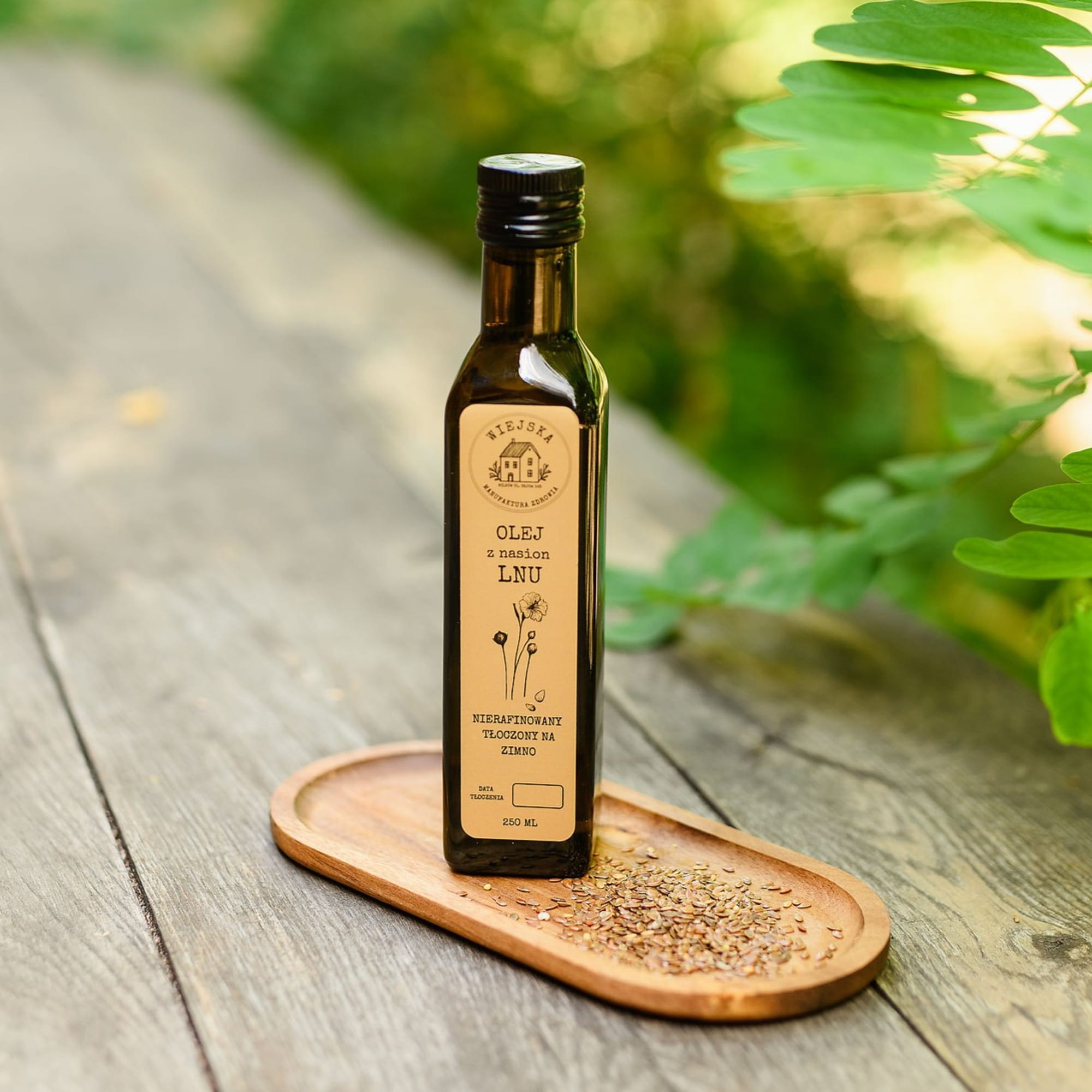 Tradycja tłoczenia oleju z nasion lnu sięga w tym regionie XIX wieku, kiedy w gospodarstwach i folwarkach działały niewielkie olejarnie. Wiejska Manufaktura Zdrowia kontynuuje te tradycje, tłocząc olej w małych partiach, w niskiej temperaturze – bez rafinacji, konserwantów i dodatków chemicznych. Dzięki temu zachowuje on naturalny aromat, delikatny smak oraz pełnię wartości odżywczych, w tym cenne kwasy omega-3, witaminy A, D, E i K oraz naturalne przeciwutleniacze.